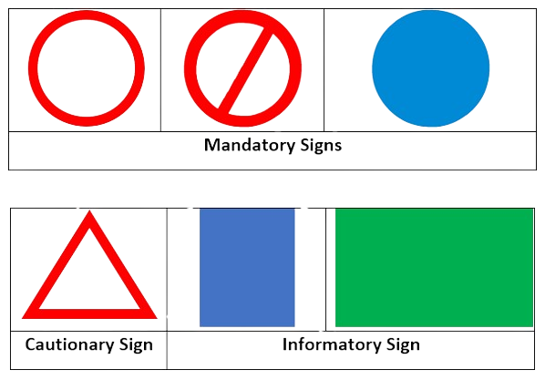 | Mandatory Signs | Circle | White with red border or red border with red diagonal | Black |