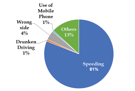 In Rajasthan 11,104 deaths were reported in 23,614 road crashes which occurred in year 2022. The analysis of deaths caused due to the traffic violations reveals that 81% people died due to speeding, 4% died due to wrong side driving, 1% deaths were reported due to mobile use, 1% due to drunk drive and 13% due to other violations.
