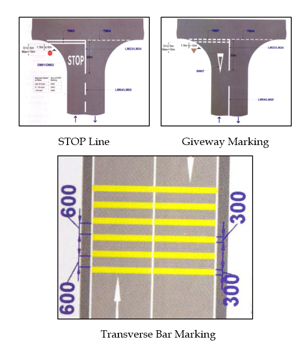 Transverse Bar Markings are provided across the carriageway for traffic control with broken lines, single / double continuous lines. The Transverse Marking shall always be accompanied with corresponding Road Sign. It establishes traffic control and its compliance is vital.
