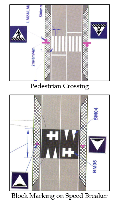 Triangular and checkered marking for speed breakers which is painted in blocks on carriageway are classified under Block Marking.