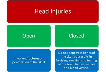 Head injuries that result from either contact or acceleration–deceleration injuries are themselves divided into two categories: open or closed head injuries. Most traumatic brain injuries are the result of closed head injuries – that is, there is no open wound to the brain.