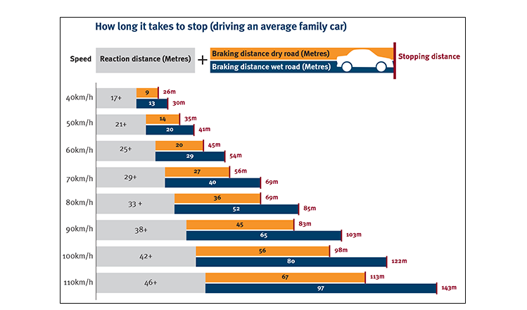 Stopping Distance is defined as the sum of the distance covered during the reaction time and the distance covered when the brakes are applied and the vehicle comes to a standstill position. Stopping distance is directly proportional the speed of the vehicle which means it will take longer distance to stop the vehicle if the speed is higher. An indicative stopping distance for various speed limits is described in the table below. It is to be noted that the stopping distance may vary according to a lot of factors such as load on the vehicle, condition of brakes, condition of tyres, type of road surface and condition of the road surface such as dry or wet. The table below describes an average stopping distance for the purpose of understanding the effect of speed upon stopping distance: